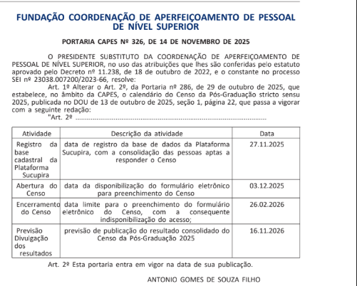 The CAPES has announced a new deadline for updating the data, accompanied by an official new schedule. All faculty and students must review and complete their information by the new date set, ensuring that all identifiers and personal data are properly filled in.